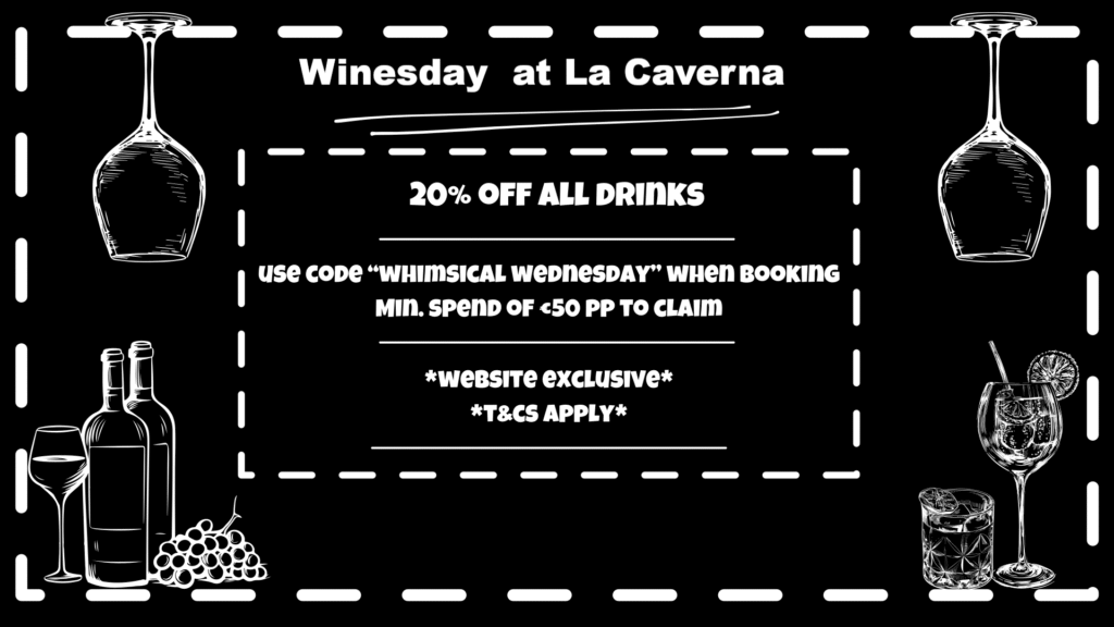 The offer is website-exclusive. Please specify ” Winesday at La Caverna” when booking to avail yourself of this offer.